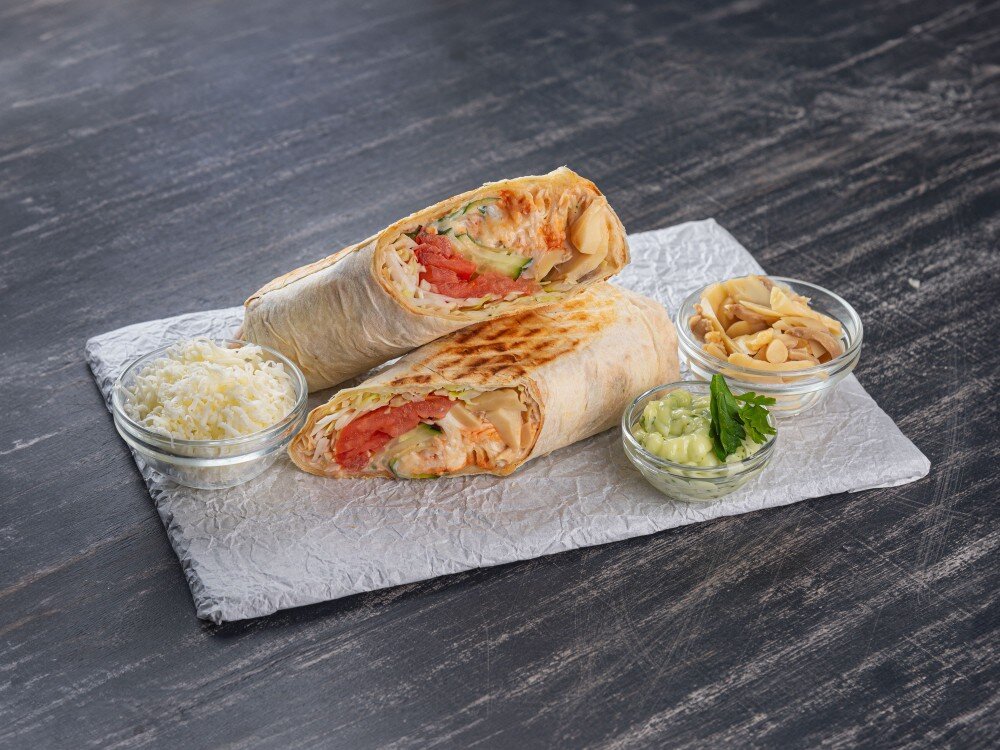 Лаваш, капуста, помидор, огурец, сыр, грибы, соус сырный, соус красный, соус чесночный, майонез