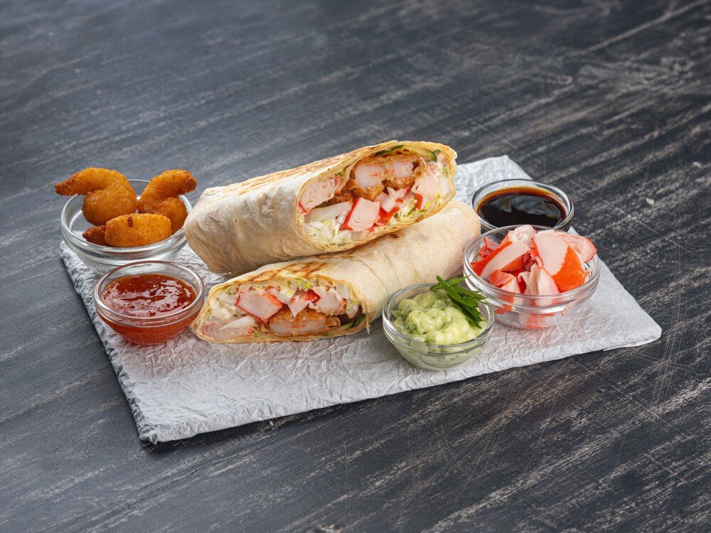 Лаваш, креветки, крабовые палочки, салат, огурец, соус терияки, соус медовый, соус чесночный